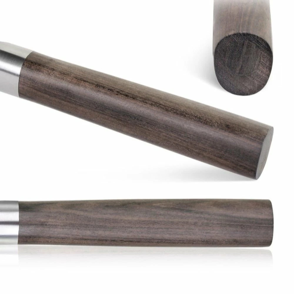 With the distinguished ripple pattern of a Damascus steel blade and the elegant warmth of an African blackwood handle, the Cangshan Cutlery Haku Series 7″ SantokuĀ Knife brings beauty and craftsmanship to the everyday tasks of slicing, chopping, cutting, and more. The hardened Damascus blade is hand-forged from stain-resistant Japanese steel and precision-sharpened to deliver the ideal balance of durability and performance. Surrounding the knife’s full-tang design, the rounded handle is crafted from dense African blackwood that provides a tactile grip and precise balance to withstand everyday use for both left-handed and right-handed users. A rich walnut sheath attaches to the knife via embedded magnets to protect the cutting edge when not in use.
