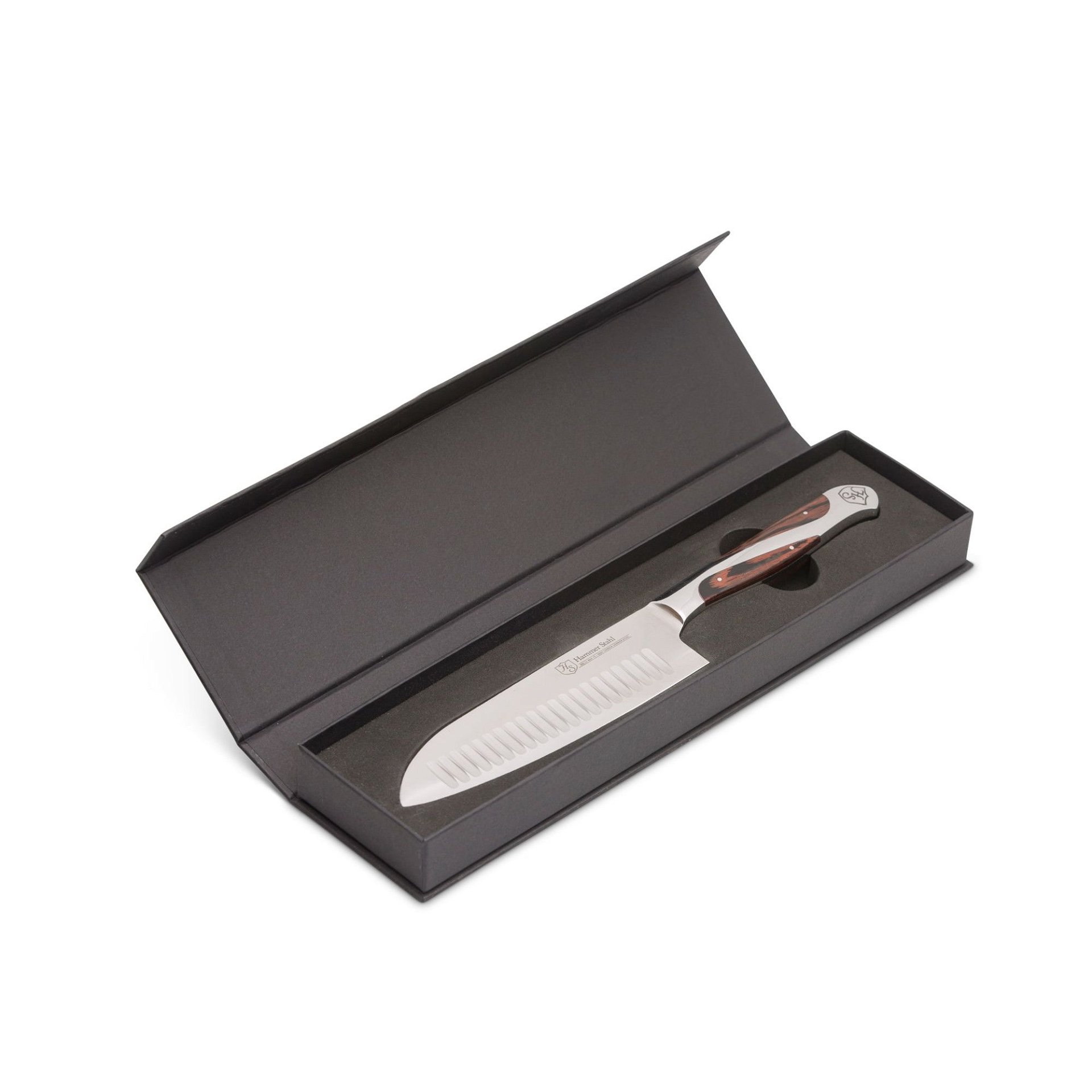 With innovation in mind, Hammer Stahl has engineered the perfect balance between beauty and function. The German high-carbon stainless steel was forged and tempered to precise specifications for optimal sharpness and durability. The razor sharp edge is honed to a 20° bevel angle with a Rockwell hardness of 55 – 57. This ensures excellent retention that can stand up to daily use. The gorgeous Pakkawood handles are infused with phenolic resin to combine natural beauty with the durability found in harder plastic. The sloped bolster provides a comfortable grip while the quad tang design provides exceptional balance. Excel in both proficiency and beauty with your new Hammer Stahl Classic Collection 5.5” Santoku Knife!