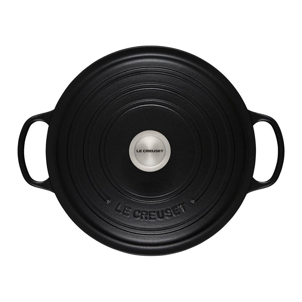 Bring the family running to the table with a mouthwatering pot roast slow-cooked in the Le Creuset 7.25-Quart Signature Round Dutch Oven in matte Licorice! The modern textured design & sleek sophisticated matte black finish coordinates well with other Le Creuset cookware pieces in the Licorice Collection or mix & match with any other Le Creuset color collection for a bold look. Prized by home cooks and professional chefs alike, nothing beats durable cast iron for braising, roasting, and slow cooking, thanks to its even heat distribution and exceptional heat retention. The smooth, sand-colored enamel interior promotes caramelization, prevents food from sticking, and resists stains. The dome-shaped lid provides a continuous circulation of heat and moisture which locks in flavor.