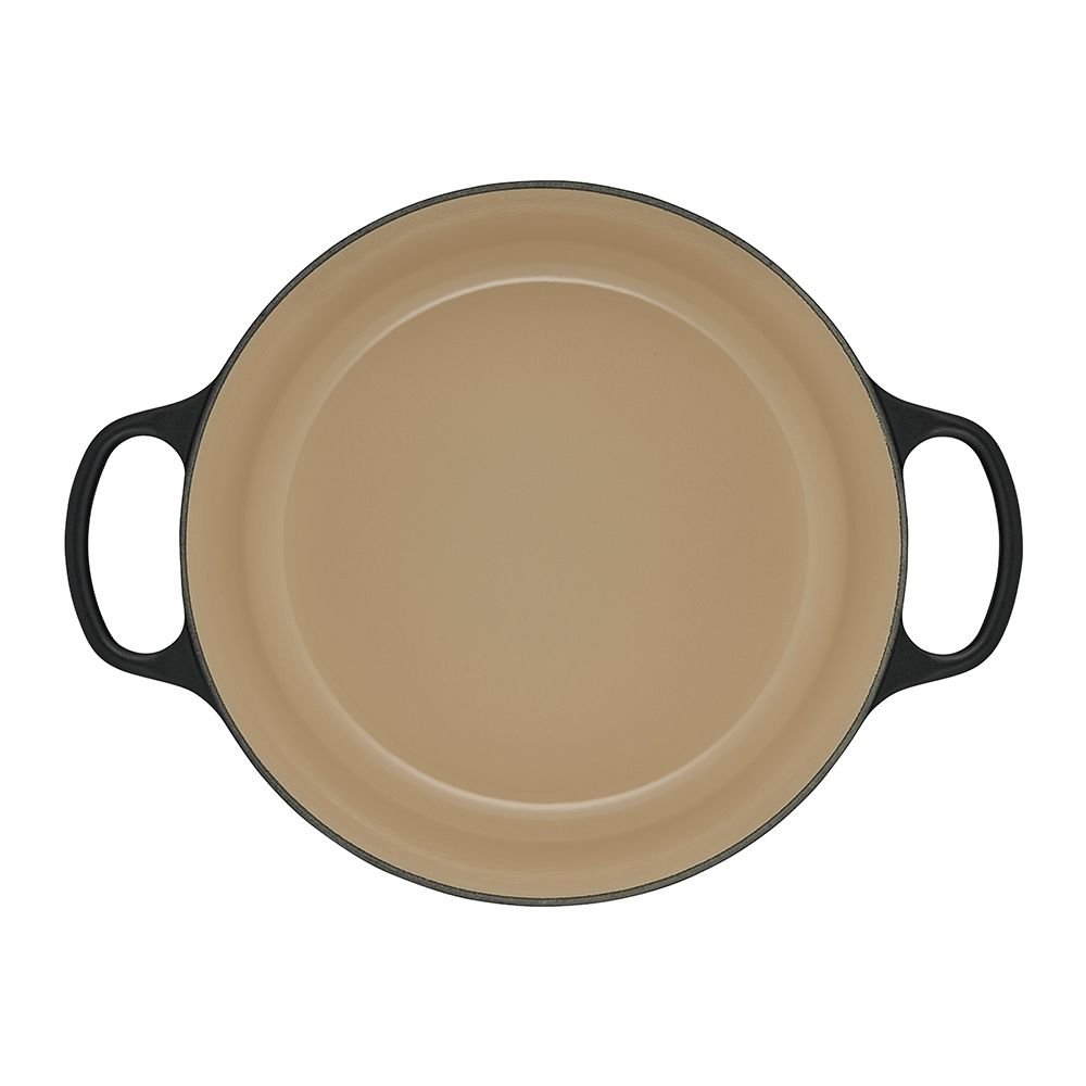 - Interior sand-colored enamel has a smooth finish that promotes caramelization while it prevents sticking and resists staining
