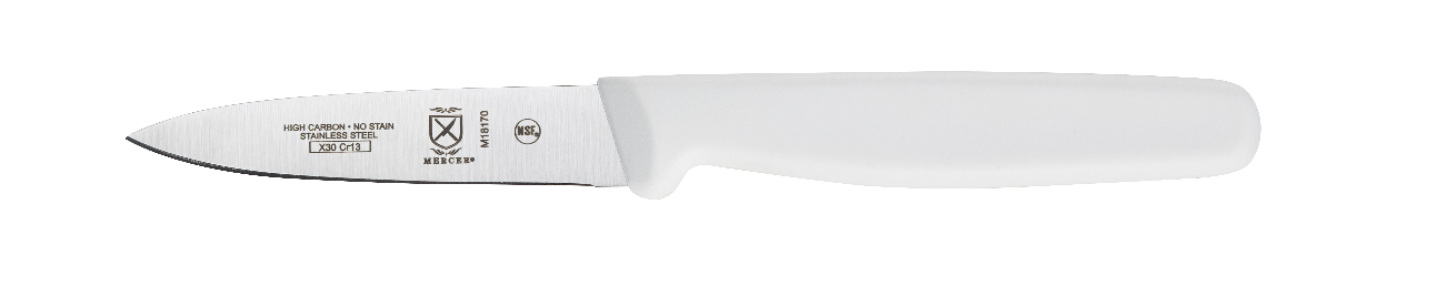 This commercial-grade Mercer Culinary Ultimate White 3.5” Paring Knife is great for trimming, thinly slicing, or peeling small and difficult to hold produce like tomatoes or garlic The exceptional quality, design, and craftsmanship make this affordable knife the ultimate tool for the value-minded kitchen.