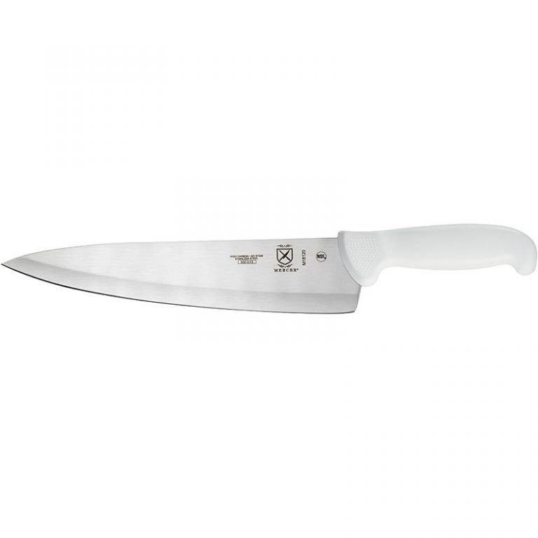 If you are looking for a do-it-all knife that can be used at home or in a professional kitchen, look no further than the Mercer 10” Chef’s Knife from the Ultimate White collection. This chef’s knife is an integral part of any chef’s cutlery collection, perfect for doing any number of kitchen tasks from prepping fruit and vegetables to breaking down cuts of meat and everything in between. As part of the Mercer Ultimate White collection, this chef’s knife is made from high-carbon, stain-free Japanese steel that resists rusting or discoloration. The hollow-ground blade is easy to maintain and sharpen, great for busy chefs who want to care for their blades on the go. To make this blade safer, it is designed with textured finger points for a non-slip grip and a finger-guard. Get a blade that can do it all, add the Mercer Ultimate White 10” Chef’s Knife to your cutlery collection today!