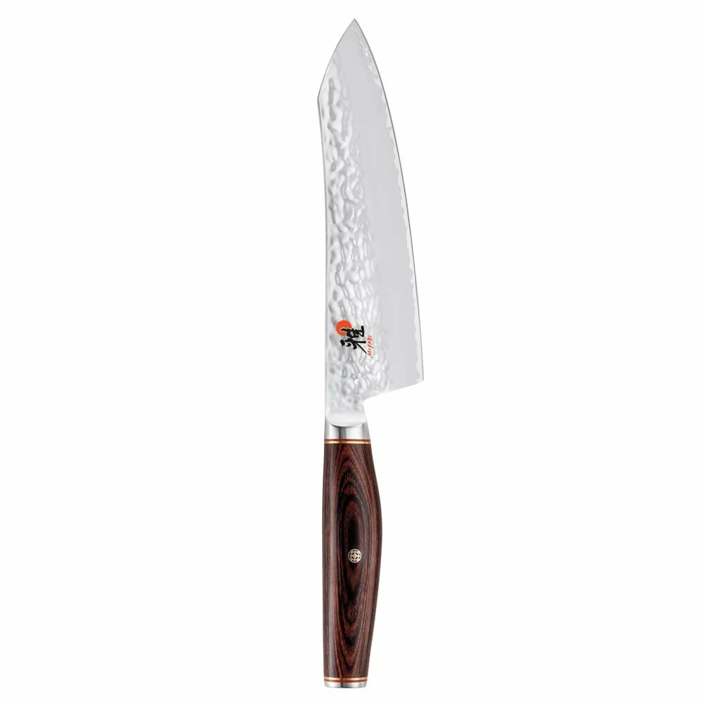 Slice, dice, and mince to perfection with Miyabi’s Artisan 7″ Rocking Santoku! Santoku blades are designed with a balanced blade and handle for optimum control and precision. This blade was crafted from high-carbon stainless steel, hammered with a Tsuchime finish to resist sticking, and then ice-hardened to 63° Rockwell Hardness for incredible strength, sharpness, and aesthetics. Miyabi’s Artisan 7″ Rocking Santoku is ideal for immaculately slicing fruits, vegetables, meats, cheese, and more!