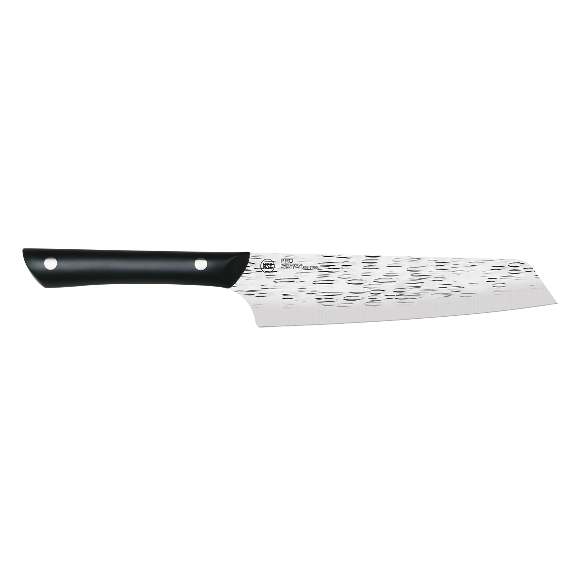 NSF-certified for use in commercial kitchens, Kai PRO knives are made of Japanese AUS6M high-carbon stainless steel and hand sharpened to a 16° edge on each side. Full-tang with a double-riveted handle, the PRO series knives are built to stand up to daily, professional use. The striking hammered blade finish is more than just beautiful; it reduces drag and helps food release from the blade easily. With a limited lifetime warranty, you can count on the precision performance this Kai PRO knife will bring to your prep work.