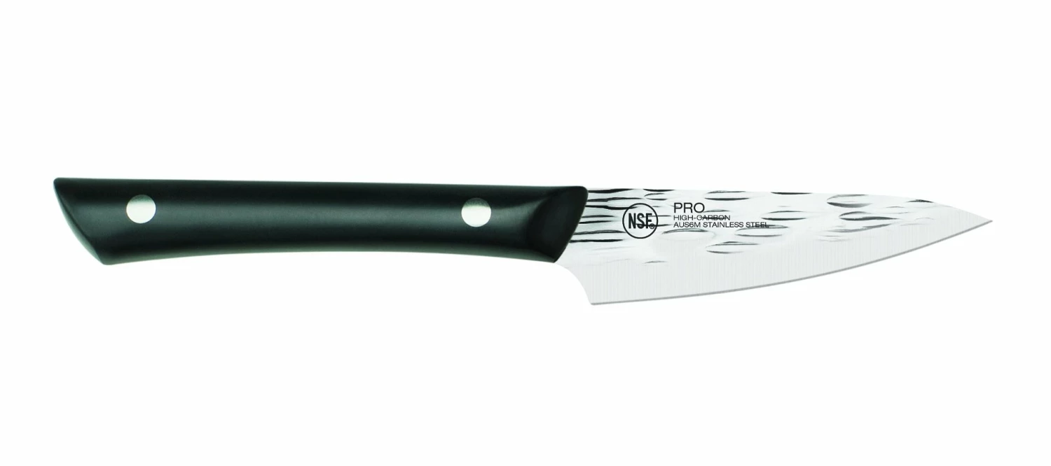 NSF-certified for use in commercial kitchens, Kai PRO knives are made of Japanese AUS6M high-carbon stainless steel and hand sharpened to a 16° edge on each side. Full-tang with a double-riveted handle, the PRO series knives are built to stand up to daily, professional use. The striking hammered blade finish is beautiful, but even more; it reduces drag and helps food release from the blade easily. With a limited lifetime warranty, you can count on the precision performance this Kai PRO knife will bring to your prep work.