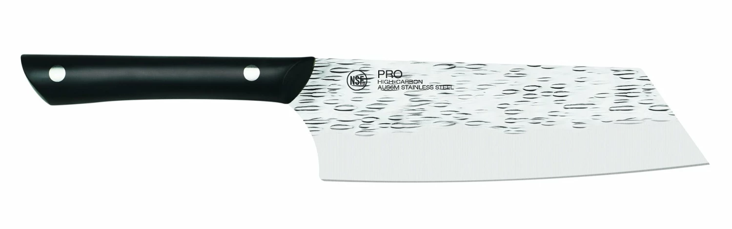 NSF-certified for use in commercial kitchens, Kai PRO knives are made of Japanese AUS6M high-carbon stainless steel and hand sharpened to a 16° edge on each side. Full-tang with a double-riveted handle, the PRO series knives are built to stand up to daily, professional use. The striking hammered blade finish is beautiful, but even more; it reduces drag and helps food release from the blade easily. With a limited lifetime warranty, you can count on the precision performance this Kai PRO knife will bring to your prep work.
