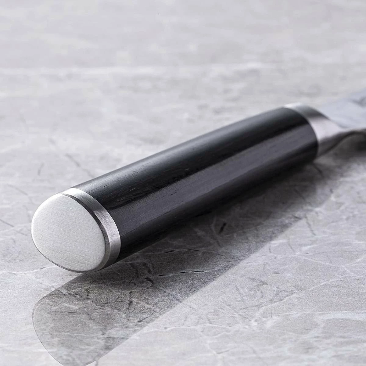 Shun Classic Series knives and cutlery use blades comprised of 68 layers of Shun’s proprietary VG-MAX steel, which are each then clad in Damascus steel for a mottled pattern that resembles fine wood grain. The result is a contemporary knife with eye-catching looks that resists corrosion and dulling, and won’t break under normal use. Elegant ebony PakkaWood® handles complement the blades and provide critical balance and a supreme grip to enhance cutting, chopping, and slicing. Now equip yourselves with quality Japanese steel—order the Shun Classic 4″ Paring Knife today!