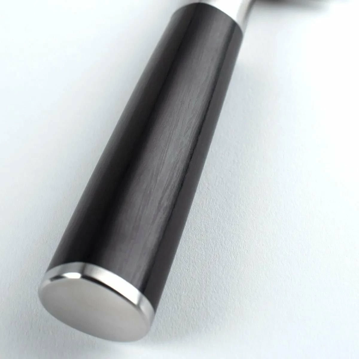 Allow yourself the right to wield some of the best Japanese knives with the Shun Classic Series! This 6.5″ Master Utility Knife will be perfect for slicing fruit, tender pieces of meat, and sandwiches due to its width. The blade is made from 34 layers of stainless Damascus cladding on each side, so the proprietary VG-MAX cutting core sufficiently resists corrosion and wear over time while each razor-sharp 16° edge promotes true precision. A D-shaped ebony-finished Pakkawood handle accompanies each blade with a full composite tang for balance and lightness, meaning these blades may be used for left & right-handed users. For a variety of kitchen tasks from preparing meat & veggies, this blade will grant finesse and maneuverability. Now equip yourselves with the best Japanese-made knives—order the Shun Classic 6.5″ Master Utility Knife!