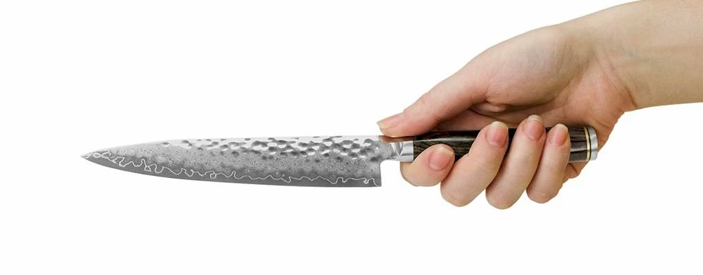 Its beautiful hammered tsuchime finish not only gives this utility knife exquisite character, but it also reduces drag, allowing the blade to more easily release foods as you slice through them. The unique PakkaWood handles are contoured for ease of use and comfort.