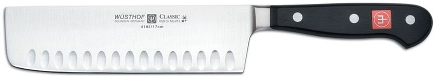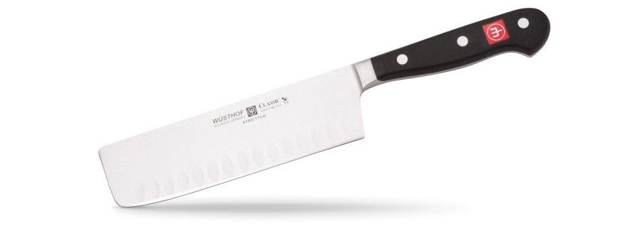 Thinly slice crisp vegetables with precision with your new Wusthof Classic 7” Hollow Edge Nakiri Knife. The Wusthof Classic series is precision-forged from a single piece of chrome-molybdenum-vanadium steel. Each Wusthof Knife contains specialized high carbon, stain-resistant alloy, and is hand-forged in the most famous knife-making town of Solingen, Germany. This Nakiri knife has a full bolster and finger guard with a full tang, triple riveted handle for precise control. When preparing your family’s meal, know you are working with the best knife available, your newly acquired Wusthof Classic 7” Hollow Edge Nakiri Knife!